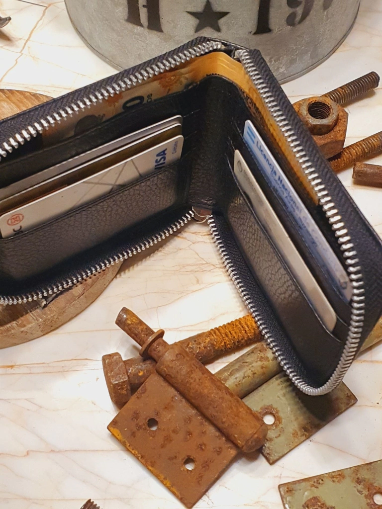 Billetera de cuero Negro com cierre Tiene dos divisiones para billetes ocho espacios para tarjetas de credito