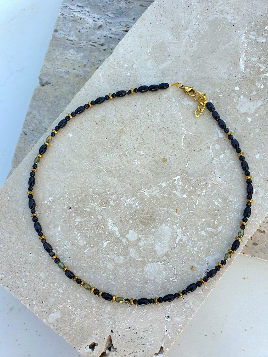 Descubrí el Collar Malibu, una pieza impresionante realizada en piedras Agatha negra, adornado con separadores de hematite dorado y un delicado detalle de cristales. Su diseño sofisticado lo convierte en el complemento ideal para cualquier ocasión.