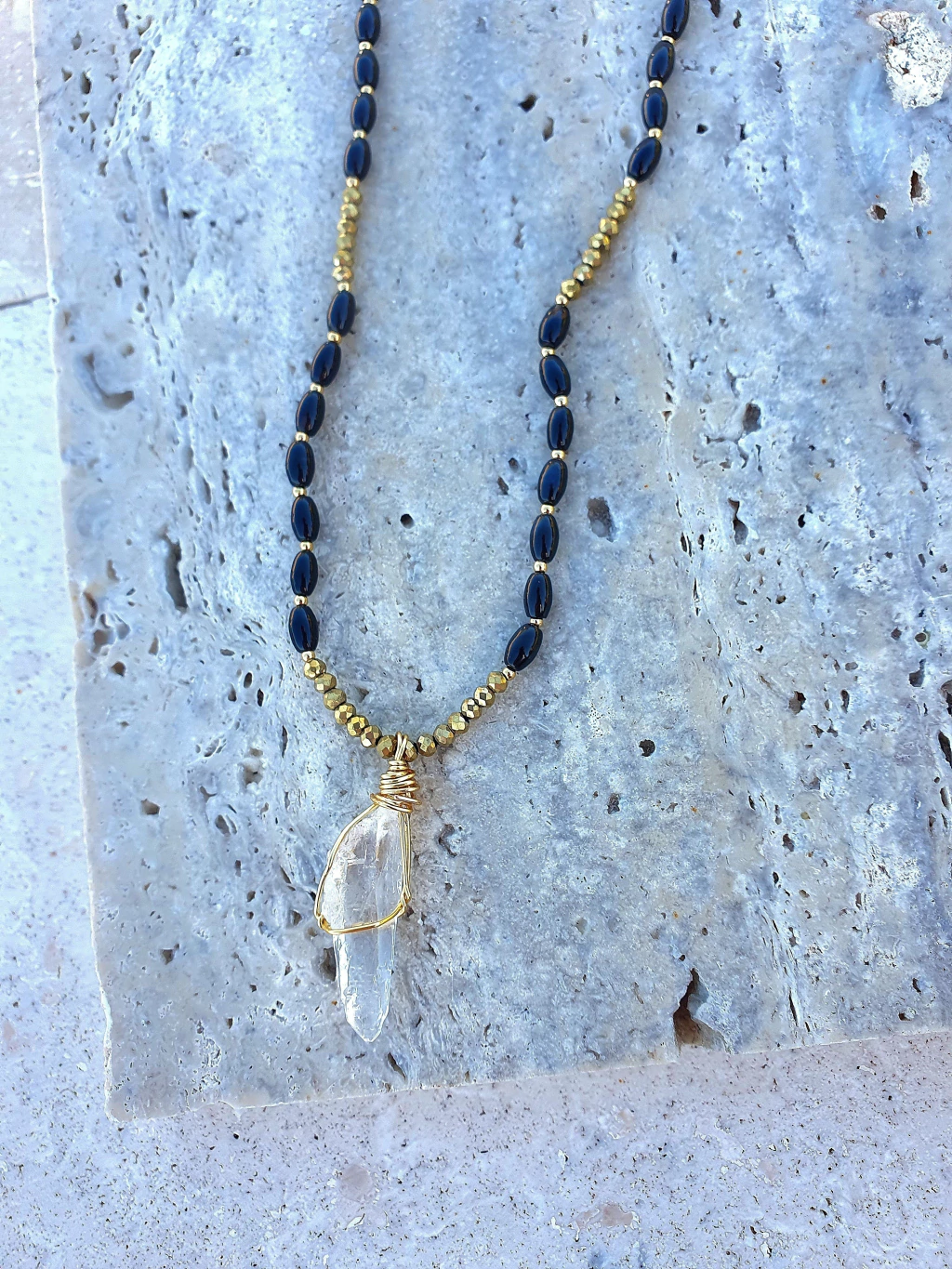 Collar Primula, una pieza de semi joyería que fusiona la elegancia de la ágata negra con el brillo del oro laminado y un delicado dije de cuarzo cristal.